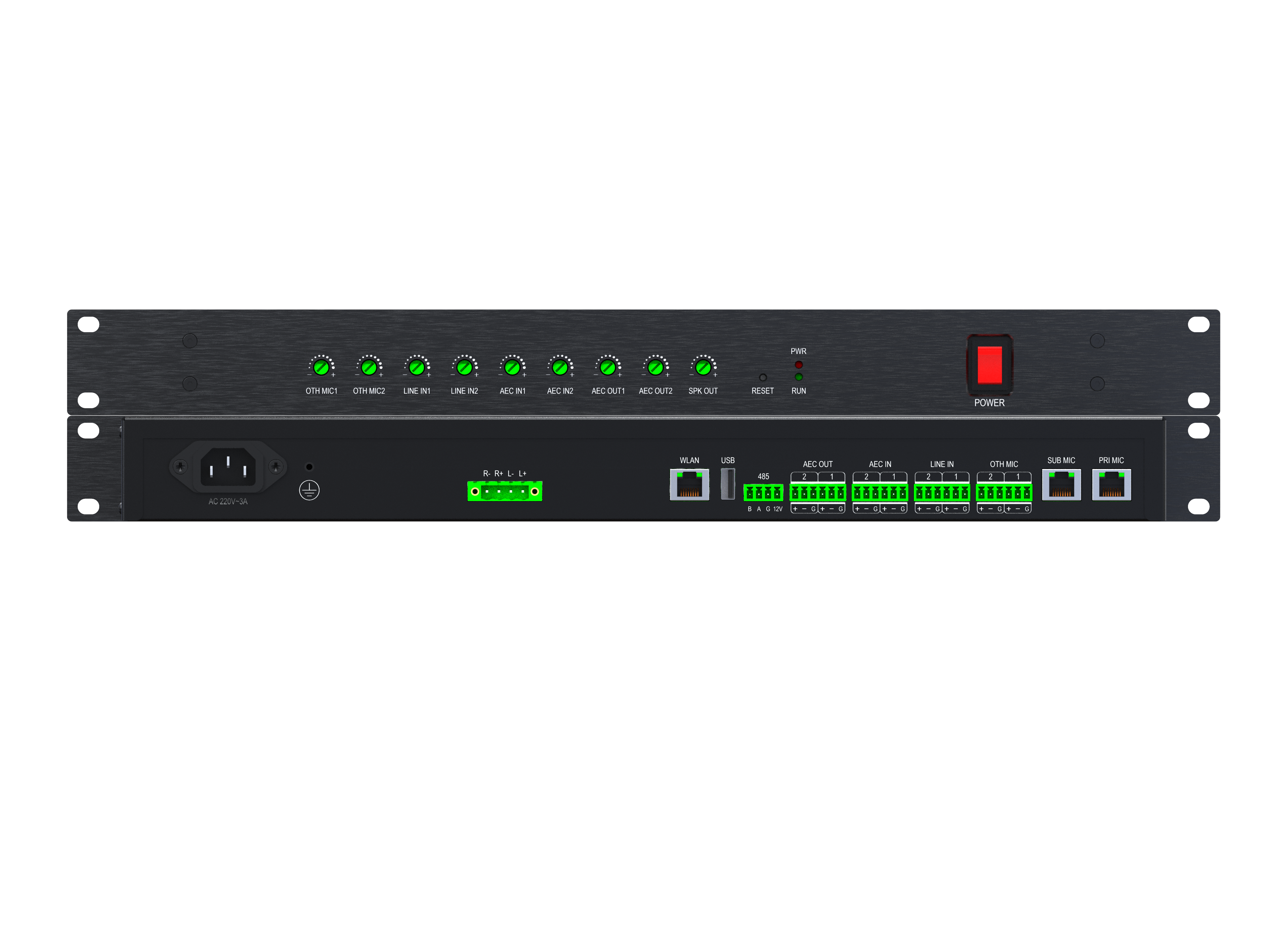 AI2000扩声互动音频处理器,采用专业音频处理器芯片,4核,1.5G主频,同时搭载有业界领先的自动反馈抑制(AFC)、自动噪声抑制(ANS)、自动回声消除(AEC)、自动增益控制(AGC)、混响抑制(ARR)、平稳噪声、瞬态噪声、波束成形等音频预处理算法,可有效提升语音扩声互动的质量;内置2*150W功放模块,可提供出色的音质表现,具有清晰、细腻、富有层次感的音效效果,让扩声更加真实、动感。