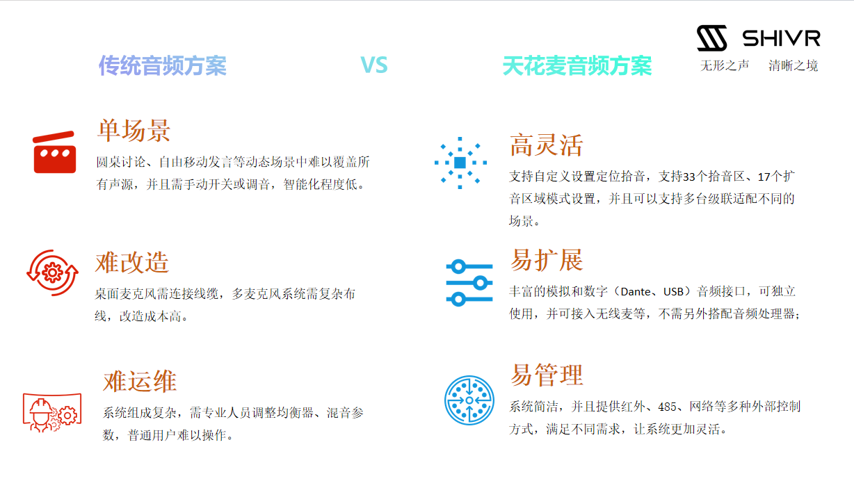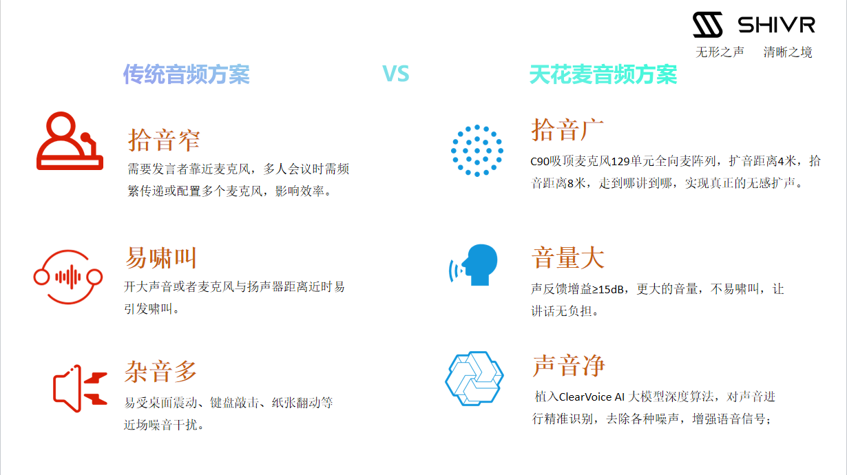 SHIVR C90天花麦克风让会议室声音管理变得简单高效,超广拾音范围,无论30人的小房间还是800人的大礼堂,每个角落都能清晰听到发言。搭载低延迟 ClearVoice AI 算法,可以自动屏蔽键盘声、空调杂音等干扰,开会专注度大幅提升。运用动态波束,讨论时智能分区收音,演讲时声音自动追踪主讲人。远程会议时,声音像面对面交流一样真实自然。简化系统,不用再摆满话筒,设备隐藏在天花板里,开会时几乎感觉不到它的存在,只剩清晰流畅的沟通体验。