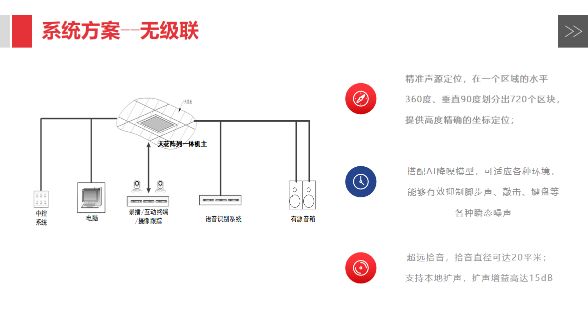l 内置32颗高灵敏度数字麦克风,单麦克风信噪比高达70db,360度全向拾音无死角,正常拾音距离可达20米,可拾取最小30dB的音量,语音清晰自然,完美还原人的原声;